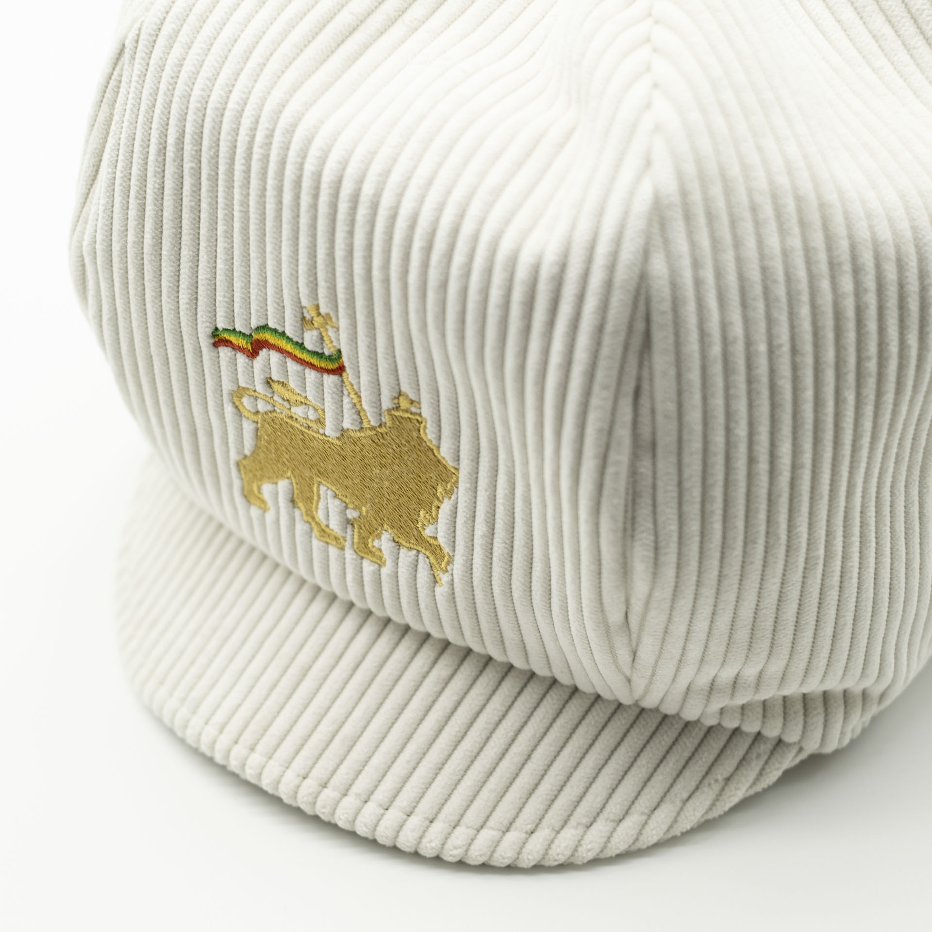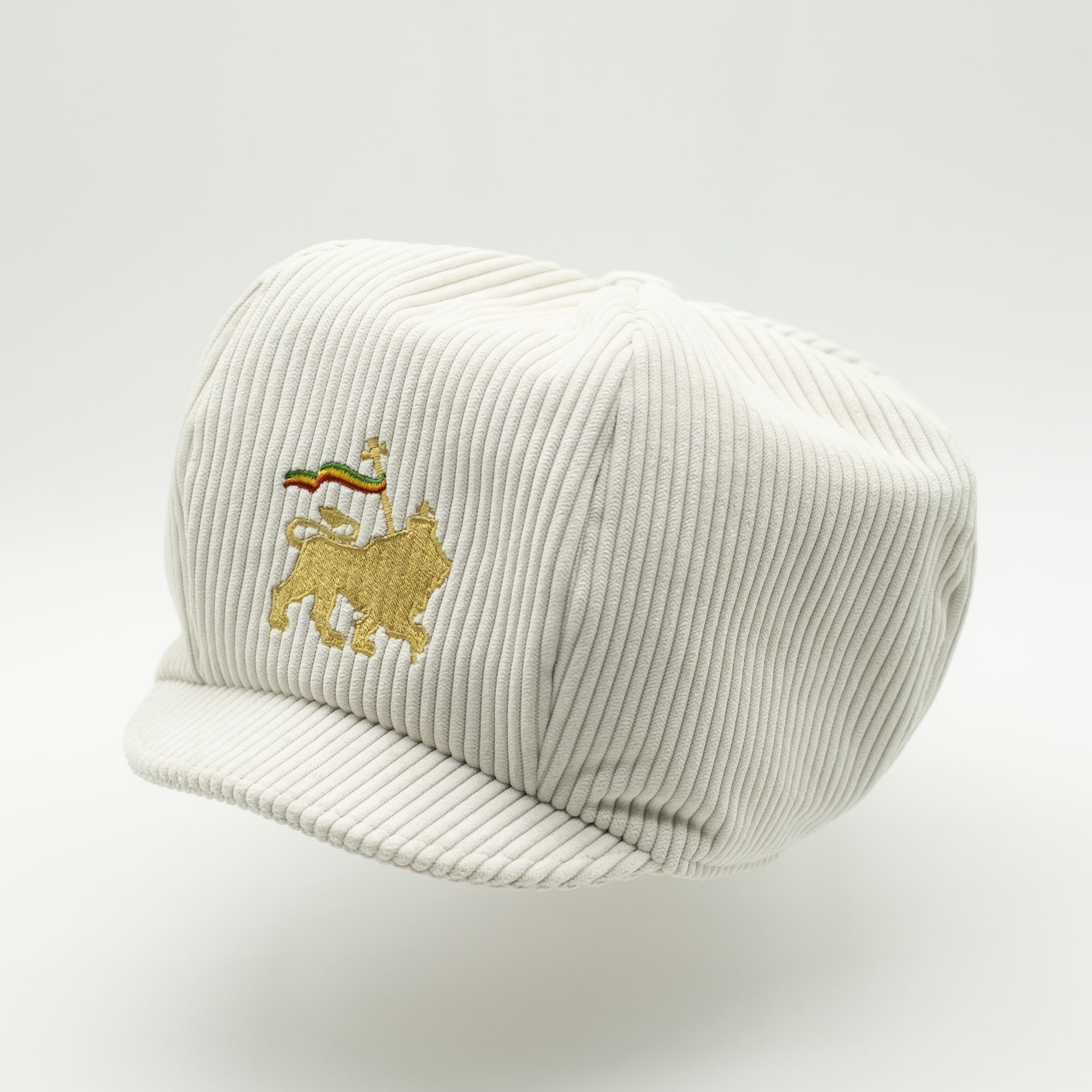 Retro-style Rasta hat for dreadlocks, carefully embroidered with a Lion of Judah on the front panel. Handmade from high-quality corduroy, lined with breathable, lightweight ecru cotton. An elastic headband ensures a secure fit.