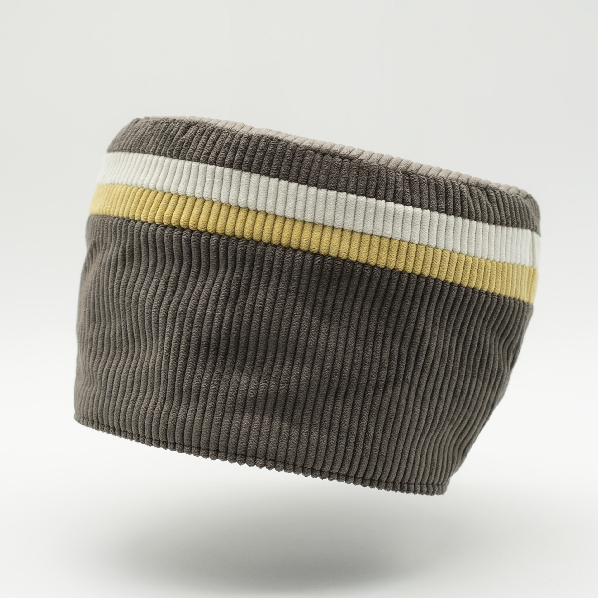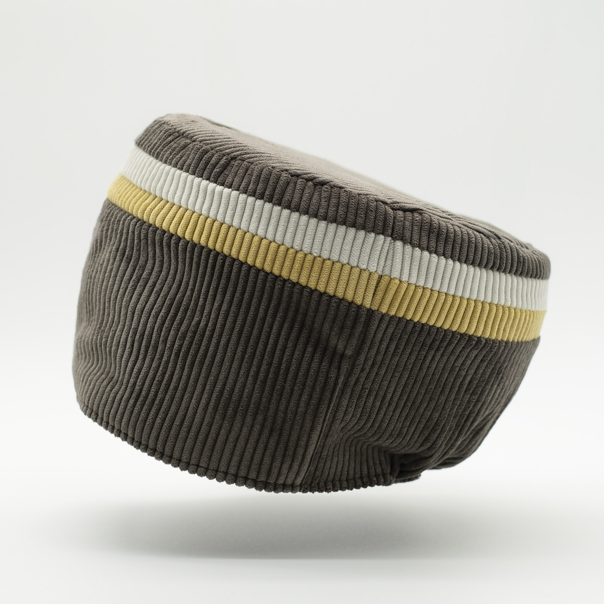 This Rasta hat in brown premium corduroy with retro vintage khaki and blue stripes. Black cotton lining and elastic headband.