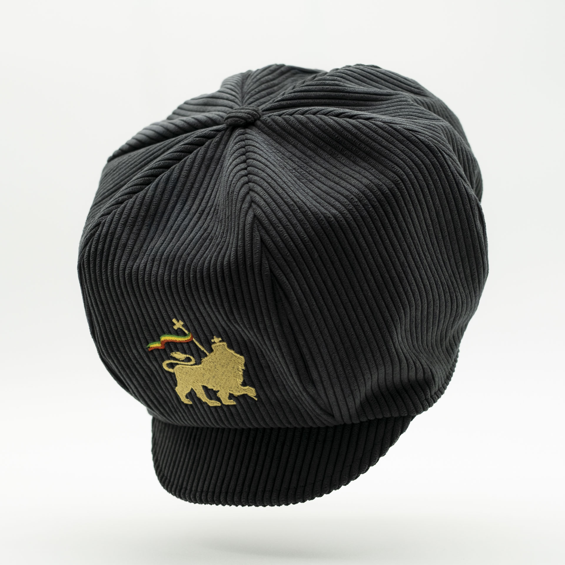 Vintage-style Rasta hat for dreadlocks, delicately embroidered with a Lion of Judah on the front panel. Handmade from high-quality anthracite corduroy fabric, lined with lightweight, breathable black cotton. The elastic headband ensures a secure fit.