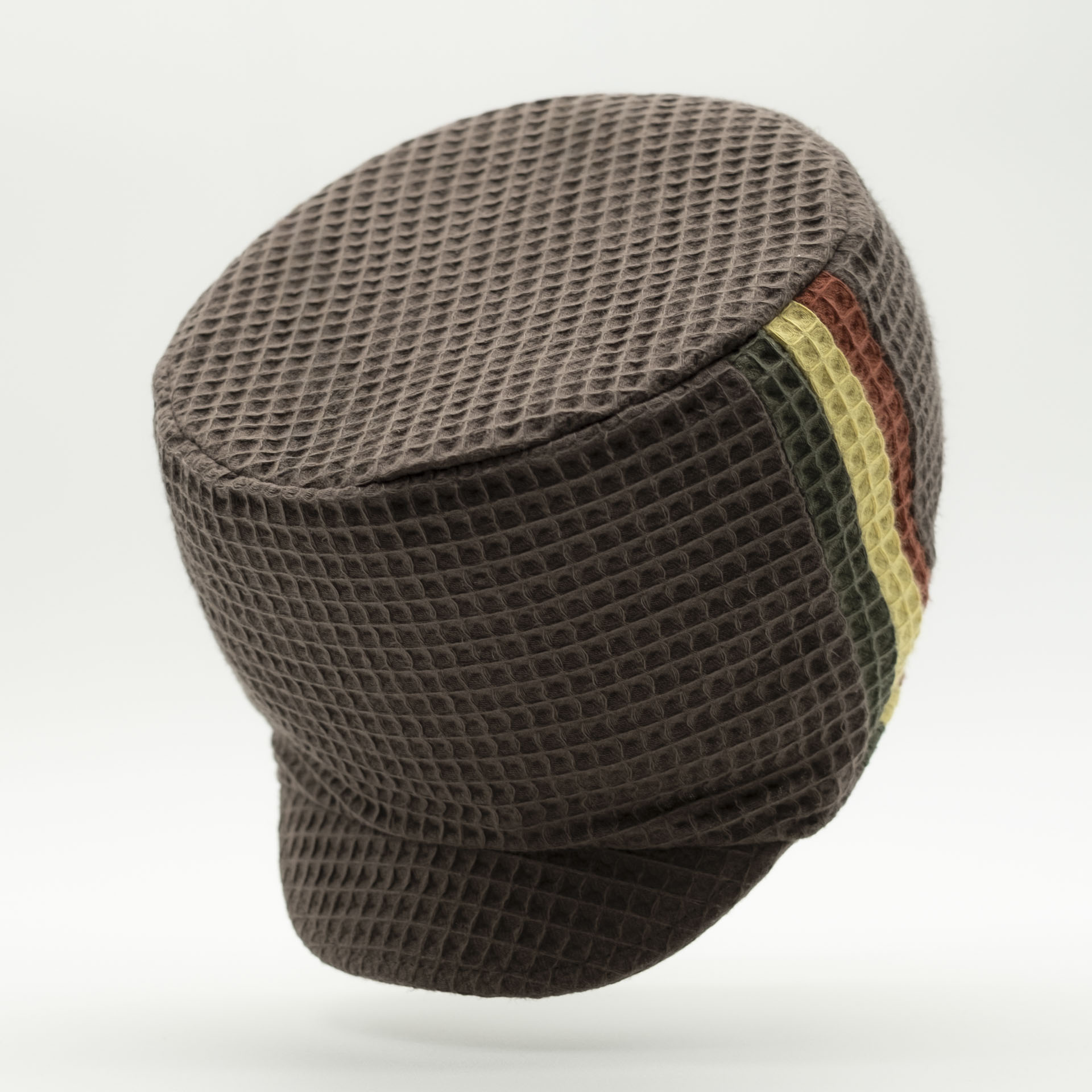 • brown rasta dreadlocks cap in waffle cotton with red gold green stripebrown rasta dreadlocks cap in waffle cotton with red gold green stripe